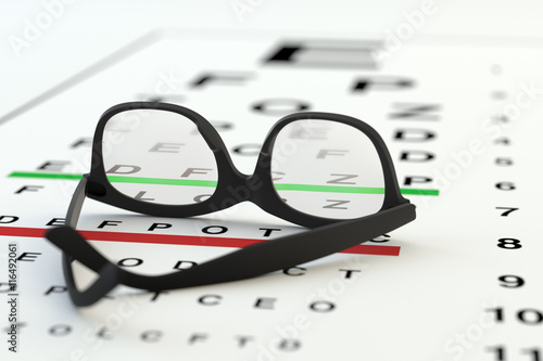Eye Glasses On Eyesight Test Chart Background Stock Photo